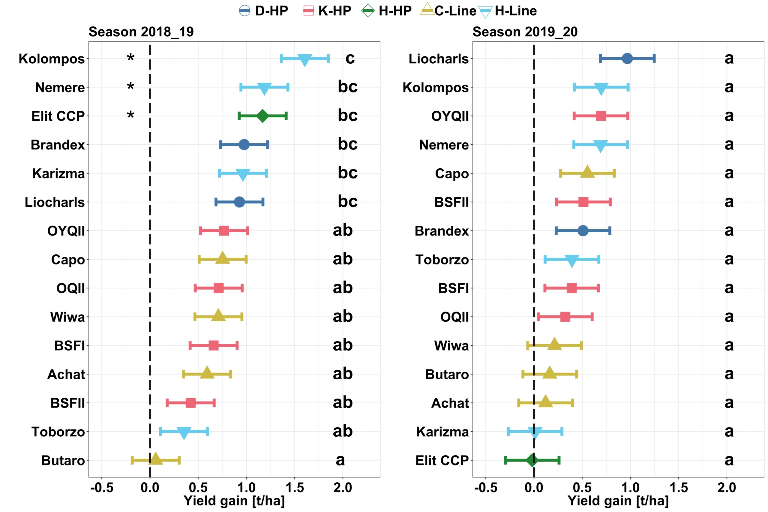 Abbildung 1: Auf der Y-Achse sind die Weizensorten und Weizenpopulationen aufgetragen. Die X-Achse zeigt den Ertragszuwachs in den Mischkulturen im Vergleich zu den Monokulturen in den zwei Versuchsjahren.